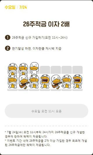24일은 필수로 참여해야 한다. 26주적금을 새로 개설한 고객에게 만기 달성시 쌓인 이자의 2배를 준다.
